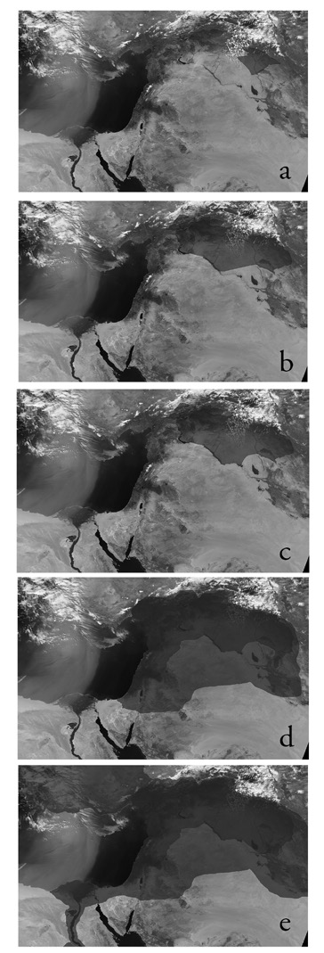 Figura 1 - Expansão imperial neoassíria. (a) Século X a.C.; (b) Século IX a.C; (c) Século VIII a.C.; (d) Tiglate-Pileser III e Salmaneser V; (e) Século VII a.C. preto = províncias assírias; cinza = estados vassalos e zonas-tampão - Modificado a partir do Google Earth Landsat Image (Hunt, 2015, p. 28)