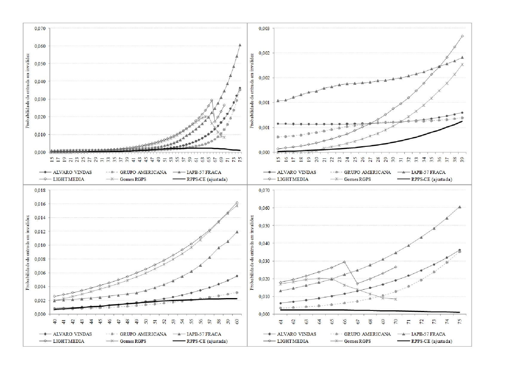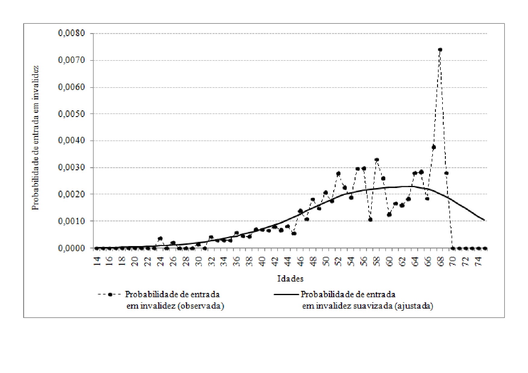 Este artigo tem como objetivo estimar a probabilidade de entrada em aposentadoria por invalidez a partir da experiência do Regime Próprio de Previdência Social do estado do Ceará. Para isso, são utilizados dados provenientes de registrados administrativos, com o período de análise entre os anos de 2013 e 2017. As probabilidades de entrada em invalidez observadas foram suavizadas por meio de uma graduação não-paramétrica. A curva ajustada para as probabilidades de entrada em aposentadoria por invalidez se caracteriza por uma tendência de elevação das probabilidades, alcançando níveis mais altos por volta da idade de 64 anos, a partir da qual as probabilidades seguem uma trajetória de declínio. Os resultados foram comparados com tábuas de mercado. Entre as idades de 40 e 60 anos, observa-se uma aproximação entre as probabilidades de entrada em invalidez para o regime de previdência em estudo e as tábuas Grupo Americana e Álvaro Vindas.