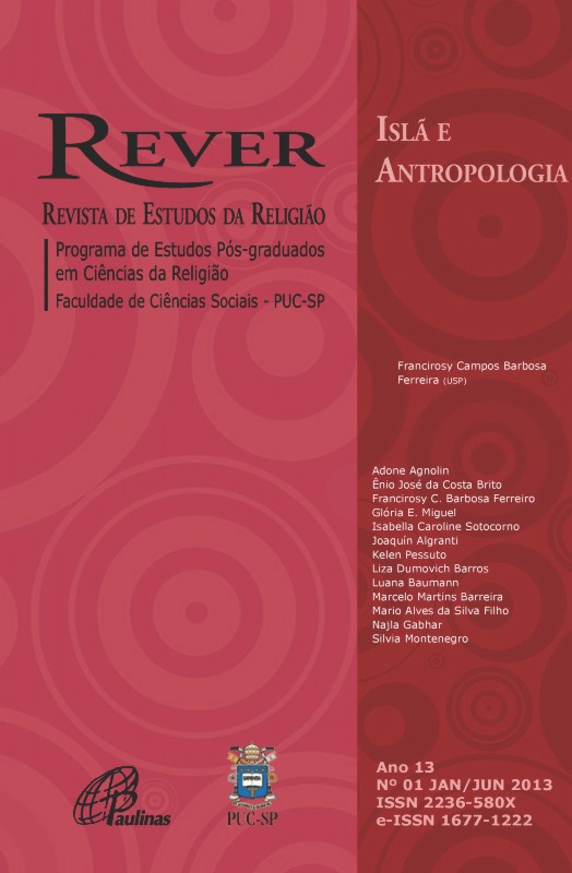 v. 13 n. 1 (2013)Pesquisas sobre o Islã vem crescendo desde o final da década de 1990, sobretudo, após o 11 de Setembro. As questões em torno da construção de identidade, do pertencimento islâmico, da conversão, assim como os relacionamentos entre homens e mulheres no Islã, questões sobre estética cinematográfica, vem ganhando destaque no cenário de pesquisas em contextos não islâmicos. Este número da REVER traz uma pequena amostra de pesquisas sobre o Islã que vem sendo realizadas em comunidades islâmicas. -