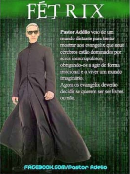 A personagem do Pastor Adélio se apresenta como uma caricatura do falso profeta, que usa a força da tradição religiosa sobre a credulidade, ao mesmo tempo ingênua e ambiciosa do público, para tirar proveitos pessoais. É engraçado também o fato de ele deixar bem claro que não acredita em nada, que está enganando mesmo. Há momentos em que se dirige ao povo crédulo, e outros que se dirige aos pastores da sua igreja para ensiná-los a ludibriar e explorar com eficiência o público. A paródia aparece aí, ao apresentar com nitidez a realidade vivenciada na sociedade atual, transpondo o texto bíblico, utilizando-o como um pretexto para chocar a sociedade e, ao mesmo tempo, denunciar uma realidade concreta presente em algumas igrejas neopentecostais.