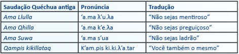 Canaviri Vargas (2002, p. 37) afirma que a fórmula do Tricálogo era repetida em cada cumprimento. Ao encontrar outra pessoa ou viajante, um deles iniciava cordialmente: “Ama Llulla”. O outro respondia: “Ama Qhilla”. O primeiro retomava: “Ama Suwa”. O outro complementava a saudação com energia: “Qampis kikillataq” (“faça você também o mesmo”). Na Tabela 1 a seguir coloca-se o diálogo junto de sua pronúncia e tradução: