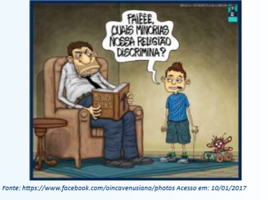 Na imagem, observa-se que o título da Bíblia está escrito de forma equivocada “BíBRA CRENTi”, que está sendo segurada por homem que por suas vestes pode-se inferir que seria um pastor ou um fiel neopentecostal e ou pentencostal. A criança faz uma pergunta “PAiÊÊ, QUAiS MiNORiAS NOSSA RELiGiÃO DiSCRiMiNA? Mas não há resposta, apenas o olhar do pai. Esse tipo de imagem é comumente encontrado nessa página, bastante polêmica, pois ela tem como característica principal demonstrar por meio de caricaturas o evangélico como um ser inculto e intolerante para com as minorias religiosas, mas que tem grande preocupação com a “salvação”.
