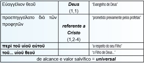 O anúncio do tema epistolar já evoca a riqueza de conceitos como εὐαγγέλιον (Bom anúncio), δύναμις θεοῦ (poder de Deus), σωτηρία (salvação/ preservação), δικαιοσύνη θεοῦ (justiça de Deus), πίστις (fé; πιστός: crente), ἀποκαλύπτω (revelar, manifestar), ζωή (vida), e, mais, o vocábulo duplo Ἰουδαῖος-Ἕλλην (judeu-pagão), o adjetivo δίκαιος (justo), o verbo γράφω (eu grafo, escrevo) para recorrer às provas recebidas da tradição escriturística.