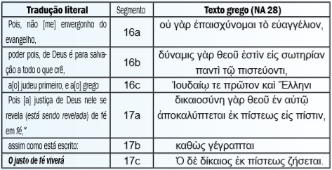 O objetivo consiste em aproximar-se do texto de Rm 1,16-17. No intuito de alcançá-lo, utilizou-se como base para a tradução e análise das variantes textuais os textos das 27ª e 28ª edições do Novum Testamentum Graece (NA-27 e NA-28).