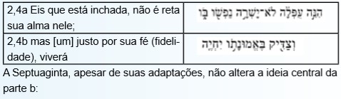O argumento veterotestamentário refere-se diretamente a Hab 2,4. Por que Paulo recorre exatamente a este argumento? Aliás, cita-o também na epístola aos Gálatas (3,11) (cf. WILCKENS, 1989, p. 116; BARBAGLIO, 2009, p. 75-76; HULTGREN, 2011, p. 57-62; p. 63-109; GIGNAC, 2014, p. 94-98). À primeira vista, poderia cogitar a dificuldade de não haver nas Escrituras muitos argumentos favoráveis à posição paulina. Verifica-se existir uma variedade de argumentos pró-lei (Dt 6,25; Sl 119,142.172 etc). Não obstante, Paulo encontra em Habacuc um argumento que eleva sua teologia a uma condição quase irrefutável: a citação do profeta (2,4), a qual infere que somente o homem justo e confiante em Deus viverá12: