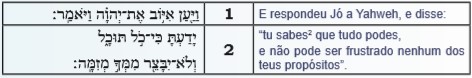 [2]Para a decisão aqui tomada de assumir-se o ketib (“está escrito”) e não o qere (“leia-se”) assinalados para Jó 42,2a, cf., quanto ao texto hebraico propriamente dito, o aparato crítico da Biblia Hebraica Stuttgartensia e, para a argumentação, MILES, 2009, p. 400: “as anotações do texto massorético ou texto-padrão do Tanach contêm o que se chama de indicações de ketib e qere (...) a primeira palavra quer dizer ‘escrito’, a segunda ‘leia’ (no imperativo).Por questão de sentido, mas também, eventualmente,, por questão de reverência, o leitor da sinagoga, instruído por essas anotações marginais, lia outra palavra diferente da que se encontrava escrita no texto. Em Jó 42:2, era instruído a trocar a palavra yäda`Tä, ‘tu sabes’, por yäda`Tî, ‘eu sei’”. Cf. a tradução “You know you can do anything” (STORDALEN, 2016, p. 197)