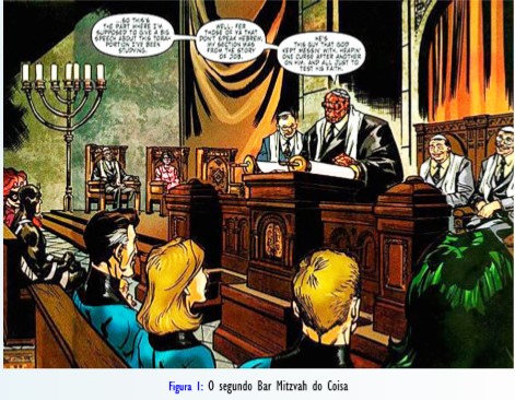 Encontram-se eventualmente também referências em várias HQs ao fato de Clark Kent, o Superman ser criado em uma igreja metodista no Kansas, a Steve Rogers, o Capitão América, e Peter Parker, o Homem Aranha, serem protestantes (não se mencionam especificamente quais são as igrejas das quais eles são membros), a Natasha Romanoff, a Viúva Negra da Marvel, ser uma ortodoxa russa não praticante, e ao judaísmo do Coisa, do Quarteto Fantástico. Aliás, este personagem é bastante interessante, por ser o único assumida e declaradamente judeu, a tradição religiosa de seus criadores, Stan Lee e Jack Kirby, ambos igualmente judeus. Nas HQs o nome do Coisa é Benjamin Jacob Grimm, nome tipicamente judeu. Personagem claramente inspirado na lenda judaica do Golem de Praga77, o Coisa é um gigante de pedra que em histórias mais recentes é apresentado discutindo abertamente temas de sua crença religiosa. Em uma história famosa, apresenta-se o Coisa (re)fazendo sua cerimônia de Bar Mitzvah, o conhecido rito de passagem judaico, porque já havia treze anos desde o acidente que o fez se transformar no gigante de pedra