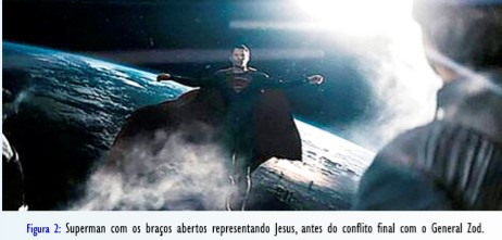 Em outro momento, na cena que ocorre na nave do General Zod11, observamos Jor-el falando para o Superman que ele pode salvar a todos. Em seguida, o herói sai da nave assumindo a postura de Jesus crucificado.