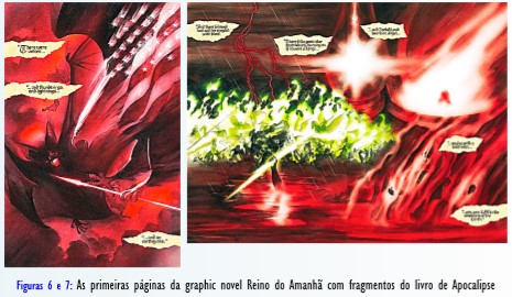 Podemos notar que essa interação ocorre logo na primeira página do Reino do Amanhã, com algumas citações explícitas de Apocalipse. A primeira, em Apocalipse 16.18:“Houve, então, relâmpagos, vozes, trovões e um forte terremoto. Nunca havia ocorrido um terremoto tão forte como esse desde que o homem existe sobre a terra.” Visualmente na primeira página a imagem de uma águia lutando com um morcego, que remete ao texto que diz “Enquanto eu olhava, ouvi uma águia que voava pelo meio do céu e dizia em alta voz: “Ai, ai, ai dos que habitam na terra, por causa do toque das trombetas que está prestes a ser dado pelos três outros anjos!” (Apocalipse 8.13 NVI)12 Esses versículos são apresentados, na sequência, por meio de uma imagem apocalíptica, em que o fogo, o sangue e as figuras humanas misturam-se em movimentos de tensão, de desespero, de angústia e a sensação de caos parece cobrir a humanidade. A essas imagens é possível identificar a ilustração das seguintes passagens de Apocalipse8.7, em que temos “O primeiro anjo tocou a sua trombeta, e granizo e fogo misturado com sangue foram lançados sobre a terra. Foi queimado um terço da terra, um terço das árvores e toda a planta verde” e em Apocalipse 8.10, “O terceiro anjo tocou a sua trombeta, e caiu do céu uma grande estrela, queimando como tocha, sobre um terço dos rios e das fontes de águas”.