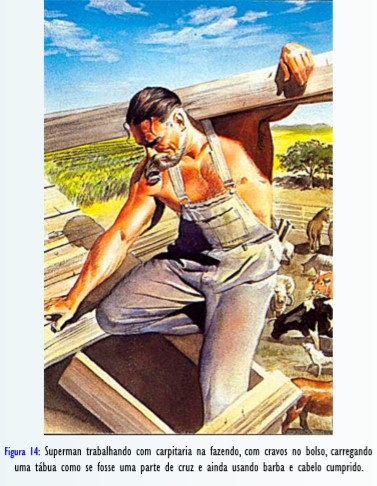 As imagens que aparecem quando vemos o Superman pela primeira vez na Fortaleza da Solidão (no original, Fortaleza da Solitude), recriando sua velha vida na fazenda, em um esforço de esquecer o mundo real, o representam como uma figura similar a Cristo: ele está fazendo carpintaria, cabelos e barbas longas, semelhantes às imagens icônicas de Cristo na tradição católica, principalmente, levando uma pesada madeira nos ombros, como se fosse uma cruz e no bolso traseiro três espinhos. A esse tipo de relação entre os elementos simbólicos da imagem, atribui a construção de sentidos do texto à interação entre produtor-texto-receptor, como no caso da imagem a seguir.
