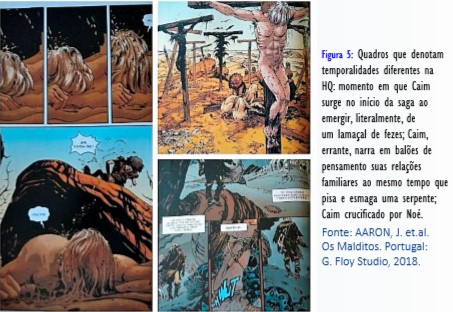 Por fim, o último quadro no canto superior direito da Figura 5. Trata-se de uma página emblemática: mostra Caim crucificado pelo seu opositor, Noé. É inegável que a imagem nos remeta a narrativas neotestamentárias da crucificação de Jesus. Se na mitologia cristã a relação entre crucificação e ressurreição de Jesus pode ser encarada como uma nova criação, uma vez que o Cristo assume e expia os pecados da humanidade (salvação), em Caim não. Sim: as narrativas guardam semelhanças pois ambos, Caim e Jesus, foram crucificados como resultado de processos violentos. Mas nas intertextualidades míticas propostas por Aaron, a ambiguidade das representações simbólicas é proposta: para Noé a morte de Caim é remidora uma vez que, autocompreendendo-se como o escolhido de Deus, ao eliminar Caim - o inventor do homicídio, toda a violência na terra seria extirpada. O dilúvio anunciado viria para completar essa missão. Porém, Caim não morre. Eis o espanto de Noé: “Nove dias. Há nove dias que estás nessa cruz. E continuas vivo. Então é verdade. Tu és o Caim”. Por outro lado, para Caim a crucificação apenas comprovava a vontade de poder, de violência dos seres humanos, criados por um Deus não menos egoísta e que utiliza da própria violência para atingir seus propósitos. Ao responder a pergunta de Aga se Deus ainda ouvia as preces humanas, Caim é categórico: “Não, Ele ouve perfeitamente. Ouve tudo. Cada grito. Cada choro. Cada suspiro. Cada pedido por misericórdia. Pela morte. Ouve tudo. Está-se é completamente a cagar”. Assim, Caim representa o paradoxo: vive a vida, tão intensa a ponto de não morrer. Mas sua vida errante em busca de sua morte acontece às custas da morte de muitos outros. Esse é o drama estruturalmente assentado nas recriações das narrativas míticas de Aaron junto com o desenho de Guéra e a colorização de Brusco.