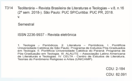 Teoliteraria: Journal of Literatures and Theologies is a biannual publication of the Postgraduate Studies Program in Theology at Pontifical Catholic University of São Paulo (PUC SP) and of the Postgraduate Program in Theology at Pontifical Catholic University of Paraná (PUC PR), Teoliteraria has partnership with the Latin American Association of Literature and Theology (ALALITE) and State University of Campinas (UNICAMP). ISSN 2236-9937.
