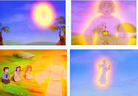 O anjo se afasta e levita ao céu, tornando-se imperceptível. A sequência termina com o sol em destaque, prenunciando, pela imagem, o signo audiovisual, o fenômeno, denominado de milagre. A animação segue apresentando cenas em que se evidencia a vida no campo das crianças e a personalidade delas: o cuidado dos três com o rebanho, som de animais, o desejo de Francisco e Jacinta por aprenderem o Catecismo com Lúcia; a bondade de Francisco ao dar dinheiro para dois conhecidos não maltratarem um pássaro, o apreço de Jacinta por dançar, a liderança de Lúcia e a oração do rosário que os três rezavam juntos durante o pastoreio.