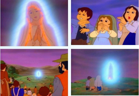 Lúcia pede para irem embora, pois haverá tempestade. Francisco afirma que não há nuvens. Mais relâmpagos ocorrem. O temor das crianças aumenta. Elas se abraçam. As ovelhas se afastam do local. Uma intensa luz paira sobre uma azinheira próxima aos três. Então, aparece “uma Senhora, vestida toda de branco, mais brilhante que o sol, espargindo luz mais clara e intensa que um copo de cristal, cheio d’água cristalina, atravessando pelos raios do sol mais ardente” (MEMÓRIAS DA IRMÃ LÚCIA, 2016, p. 198 - 199). A animação em questão faz uso da luz para indicar a chegada e, posteriormente, a presença mariana no local tal como nas aparições que teriam ocorrido em Fátima e em outras localidades ao longo da história.
