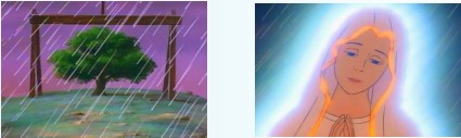 A terceira sequência que apresenta aparições marianas ocorre ao fim da narrativa e se refere à última aparição, a do dia 13 de outubro de 1917, que reuniu milhares de pessoas. De pé, muitas com guarda- -chuvas, esperam ansiosas e outras impacientemente por aquele momento. Lúcia, Francisco e Jacinta estão ajoelhados. A chuva é constante há horas. As cores em tom escuro do plano de fundo da cena contrastam com as do restante da animação, a fim de evidenciar a tempestade que ocorre. No entanto, as cores e o temporal podem ser associados não apenas à condição climática, mas uma metáfora para o mundo. Em um período de guerras, de inúmeras doenças, com altas taxas de analfabetismo e demais problemas educacionais, sanitários, sociais e tantos outros, o temporal, ocorrido por algumas horas, representa esse estado da sociedade da época que vem suplicar a Maria por melhores condições de vida. A chuva também é, universalmente, considerada o símbolo das influências celestiais, um agente fertilizante do solo (CHEVALIER; GUEERBRANTE, 1986, p. 671). Tal como ela fertiliza a terra, uma atmosfera de paz penetraria nas pessoas instantes depois como os signos audiovisuais evidenciam a seguir.