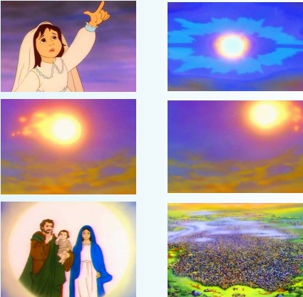 Das mãos de Maria, irradia luz que sobe em direção ao sol. Lúcia aponta para o céu, segundo ela, levada por um movimento interior que a impeliu (MEMÓRIAS DA IRMÃ LÚCIA, 2016, p. 208). O milagre prometido surge aos olhos da multidão. O sol começa a girar, a dançar e a lançar flashes de luz no céu. As cores, antes escuras na cena anterior e tenras no restante da animação, são agora ainda mais fortes e carregadas de energia. Muitos tons se assemelham aos da aquarela da abertura. As pessoas ficam extasiadas com o que veem, apontando para o sol. Porém, o fenômeno também desperta medo, principalmente quando o sol aumenta de tamanho, preenchendo a tela, dando a entender que se aproxima do solo a tal ponto de colidir com a multidão. Mais uma vez, uma sensação de forte tensão é amenizada: dá-se um breve destaque a um personagem, justamente a alguém que não acreditava nas crianças e que as perseguiu. Ele coloca o braço em frente ao rosto, denotando o medo pela possível colisão. No entanto, confirma que o sol voltou ao lugar de onde veio sem lhes causar mal algum. Outro personagem toca no chão e vê que o solo está seco.