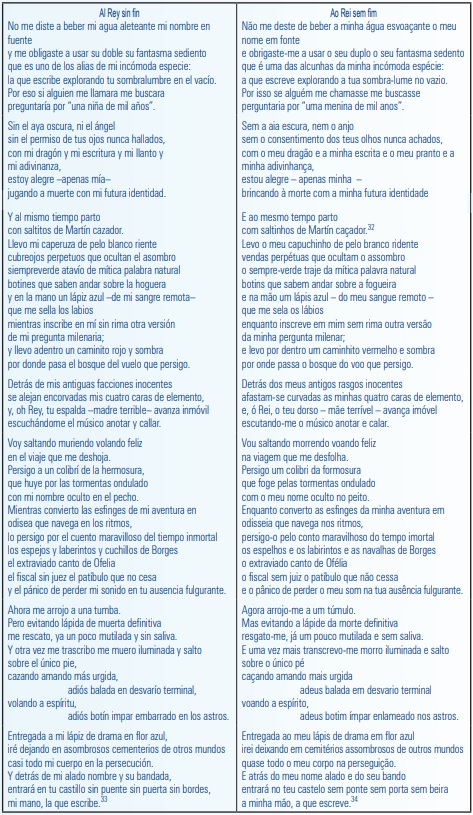 Señala de Certeau que “el místico”, “el caminante”, “el viajero” contemporáneo “ya no tiene fundamento ni fin”. Curiosamente el poema de Biagioni se dirige a un “Rey sin fin”, ¿acaso hace eco de este postulado? Y luego continúa afirmando el crítico francés: “[...] siempre en busca de un cuerpo o de un lugar poético. Continúa caminando, trazándose en silencio, escribiendo”36. ¿Harán eco de esta afirmación los versos del poema de Biagioni en los que la espalda del Rey avanza inmóvil escuchando su “músico anotar y callar”?