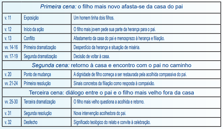O enredo foi retratado a partir do binômio conflito-solução. O conflito fundamental da parábola é o afastamento do filho mais jovem da casa paterna e a dramatização retrata o sofrimento por estar longe, sem os bens que dão sustento à vida, entendidos para além do suporte material. A resolução do conflito começa com a acolhida do pai na ocasião do retorno. No enredo, a atitude de “mover-se de compaixão” (v. 20) configura-se como o ponto de mudança da narrativa, pois dá início a uma série de transformações que levam a narrativa ao descanso, após uma dramatização apendicular. Nesse sentido, a atitude compassiva do pai é colocada como a chave de leitura dos acontecimentos que seguem.