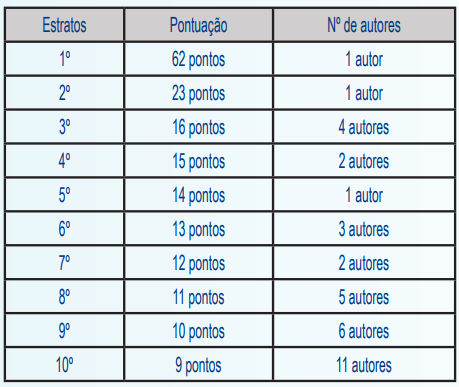 O gráfico 1 demonstra a importância de um autor na revista desde em que cada ponto indica a presença do autor em um artigo, desconsiderado o número de vezes que aparece no mesmo, tal qual mencionado acima. As referências estão distribuídas em nove estratos de pontuação, entre os mais citados somando com isso os 36 autores mais citados, excluindo as autocitações, entre as mais de 3.000 referências bibliográficas utilizadas na Teoliterária: