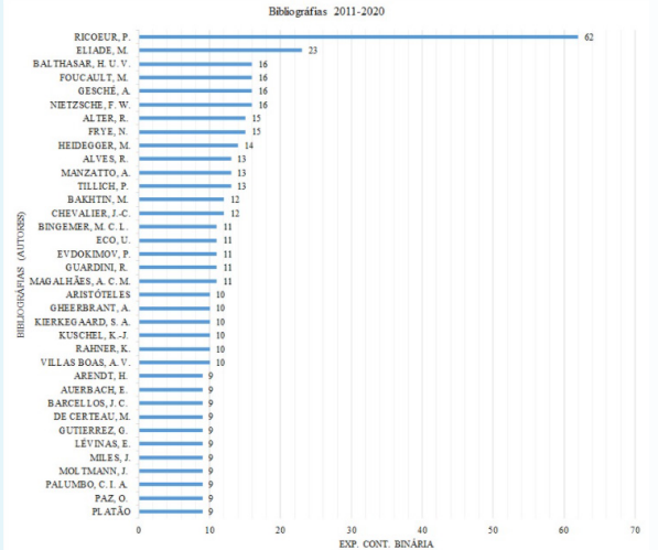 Assim, entre artigos publicados na Revista Teoliterária no período de 2011 a 2020, a referência bibliográfica mais utilizada é Paul Ricoeur, com um índice de 62 pontos, sendo não somente a referência de maior destaque, mas também despontando em todo o período da revista. Em seguida tem-se Mircea Elide, com 23 pontos de referências bibliográficas, sendo a segunda referência mais utilizada. No terceiro estrato, com 16 pontos de referência aparecem (em ordem alfabética por sobrenome) Hans Urs von Balthasar, M. Foucault; A. Gesché; e F. Nietzsche. Com 15 pontos de referências bibliográficas aparecem no quarto estrato aparecem R. Alter e N. Frye. Com 14 pontos de referências bibliográficas, no quinto estrato, aparece somente M. Heidegger. No sexto estrato, com 13 pontos aparece pela primeira vez autores brasileiros como R. Alves; A. Manzatto e P. Tillich. Com 12 pontos, o sétimo estrato consta como referências M. Bakhtin e J-C. Chevalier. No oitavo estrado, com 11 pontos de referências bibliográficas tem-se M. C. Bingemer; U. Eco; P. Evdokimov; R. Guardini e A. C. Magalhães. Com 10 pontos, no nono estrato tem-se Aristóteles; A. Gheerbrant; S. A. Kierkegaard; K-J. Kuschel; K. Rahner e A. Villas Boas. E por fim, com 9 pontos o décimo estrato conta com H. Arendt; E. Auerbach; J. C. Barcellos; M. de Certeau; G. Gutierrez; E. Lévinas; J. Miles; J. Moltmann; C. I. A. Palumbo; O. Paz; Platão. A presença dos brasileiros se faz presente no sexto, no oitavo, no nono e no décimo estrato.