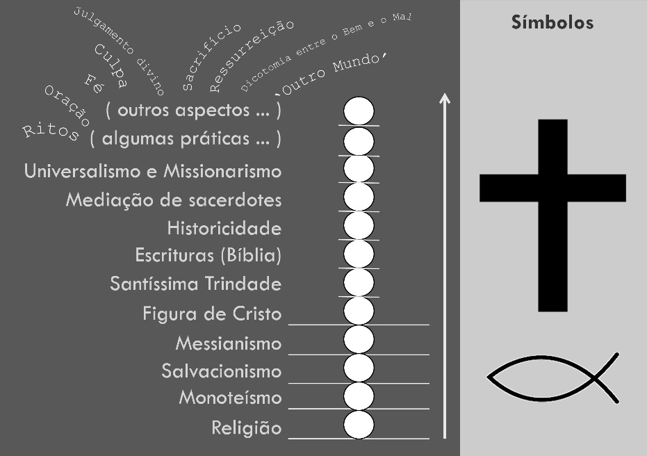Antes de prosseguir, quero lembrar que já mencionei que os conceitos podem ser expressos também visualmente, e não apenas verbalmente. Todavia, para que um símbolo possa ser compreendido como um conceito eficaz, é necessário que ele mostre em uma imagem todas as notas necessárias que fazem parte da ‘compreensão’ do conceito que se quer representar. No ‘Quadro 2’, expus ao lado direito dois símbolos visuais muito empregados para o Cristianismo, entre os tantos que têm sido estudados (DILASSER, 1999). Temos a figura do “peixe”, mais usada nos tempos antigos, e a figura da “cruz”, que se popularizou desde a Idade Média. Não obstante a sua utilidade simbólica, estas imagens não são conceituais. A cruz evoca de fato alguns elementos que dela fazem um símbolo bastante adequado para o Cristianismo, embora não possa ser considerada um bom símbolo conceitual, uma vez que muitas das notas importantes para a compreensão do conceito de Cristianismo ficam ausentes deste símbolo simples. Ao pensarmos na cruz como símbolo do Cristianismo, pode-se argumentar que este objeto simbólico evoca enfaticamente dois mundos – o mundo natural-humano, representado pela barra horizontal, e um mundo sobrenatural, representado pela barra vertical. Dois mundos que não apenas existem concomitantemente, mas que também se cruzam em um ponto. A presença deste ‘outro mundo’ – um mundo divino que se contrapõe e se superpõe ao mundo humano – é uma nota importante no acorde conceitual do Cristianismo, embora, para não o alongar muito em nossa representação visual, eu a tenha situado no feixe que parte dos ‘outros aspectos’, no topo do acorde registrado no lado esquerdo do ‘Quadro 2’.