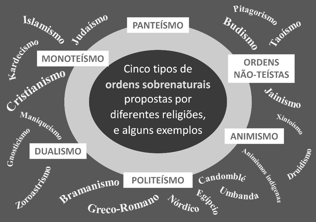 Esse lugar – este lócus ou gene que define o tipo de ordem em que a religião em análise se baseia – pode ser ocupado por um número mais ou menos restrito de diferentes notas ou possibilidades. Habitualmente podemos enxergar pelo menos seis notas alternativas que ajudam a organizar a vasta gama de diferentes religiões e formas religiosas ou proto-religiosas. No ‘Quadro 3’ expus seis tipos principais, ou seis notas relacionadas às formas de conceber a realidade sobrenatural que interage com o mundo natural e humano: Monoteísmo, Dualismo, Politeísmo, Animismo, Panteísmo e Não-teísmo (ordens regidas não mais por deuses, mas ainda assim geridas por princípios supranaturais ou leis que precisam ser conhecidas para conduzir os seres humanos a uma vida iluminada). Estes tipos ou notas puras, na verdade, admitem combinações possíveis umas com as outras, conforme também veremos, de maneira que, em determinada religião, a nota animista pode temperar o modo politeísta, ou podem se dar outras combinações como esta, assim como assistimos combinações similares entre concepções monoteístas e derivações de formas religiosas derivadas do paganismo (ATHANASSIADI & FREDE, 1989; MECONI, 2000 e TERRIN, 2003).